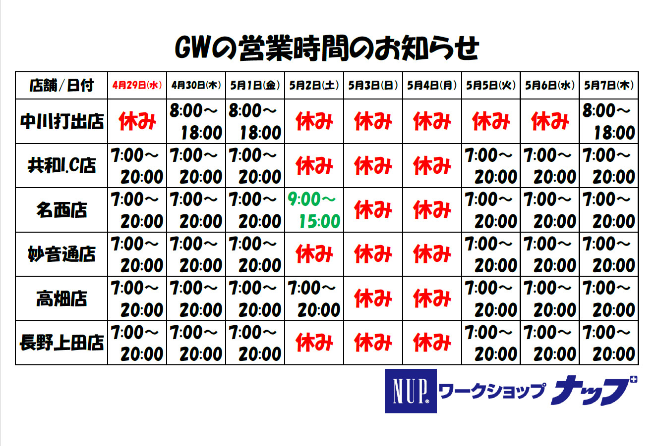 妙音通店・共和IC店はお休みさせて頂きます。 4/4(土):休み 4/11(土):休み 4/18(土):休み 4/25(土):休み